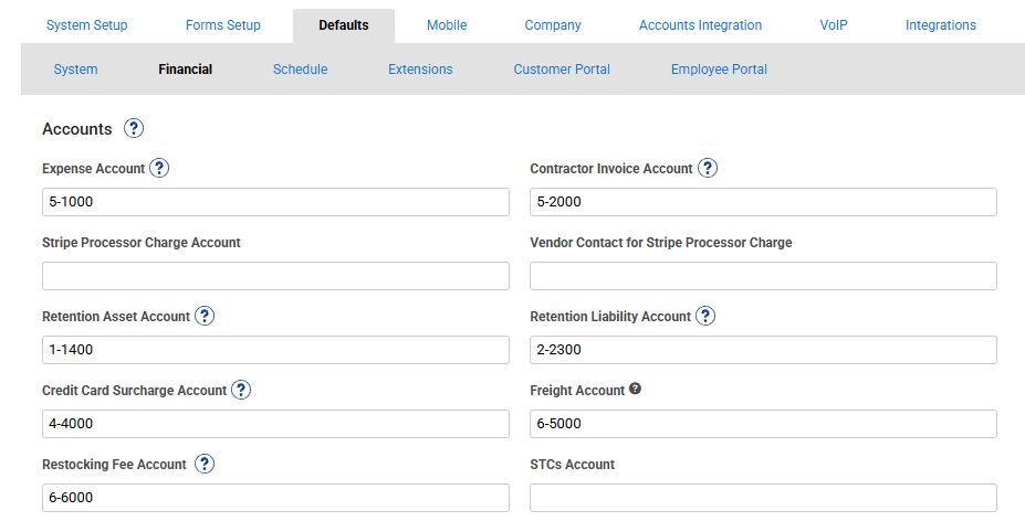 In System Setup > Accounting Integration, enter a Stripe Processor Charge Account and Vendor Contact for Stripe Processor Charge to make sure your Stripe fees from Simpro Premium are recorded against the right account.