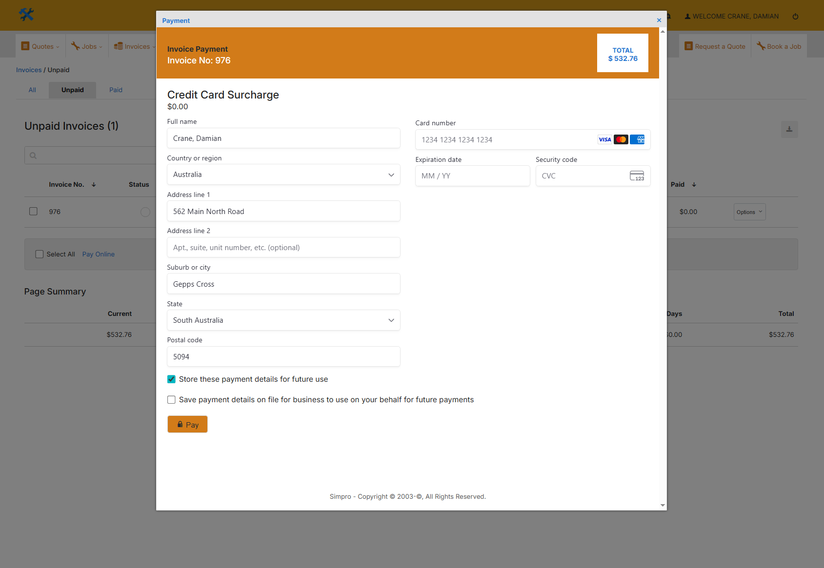 Note: Only users who have the Use Payment on File option selected in their assigned security group in Simpro Premium can process payments using customers’ saved payment details.
