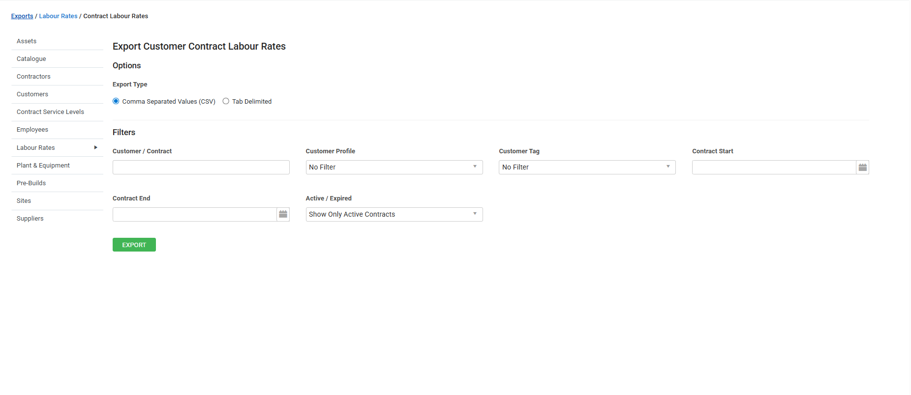 Go to Export > Labour Rates, click Customer Contract Labour Rates to export customer contract labour rates details. After you select the preferred Options and Filters, click Export.