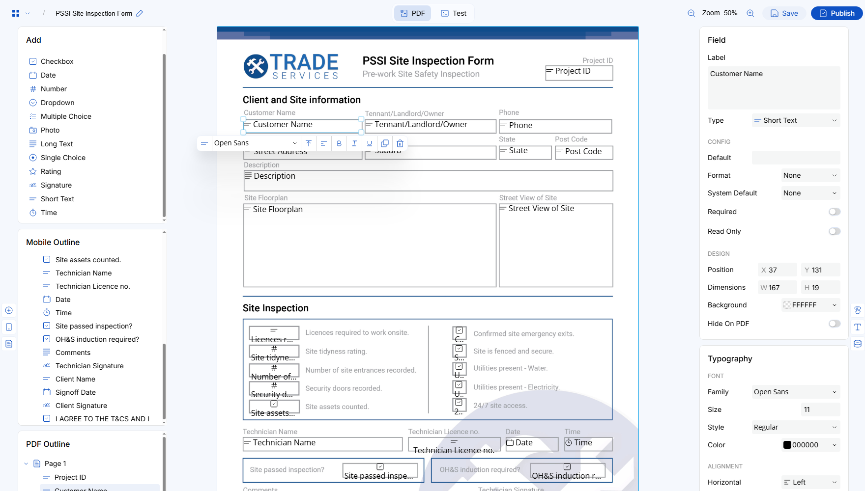 - Click Test to preview filling in the form as though it is being completed on a mobile device.